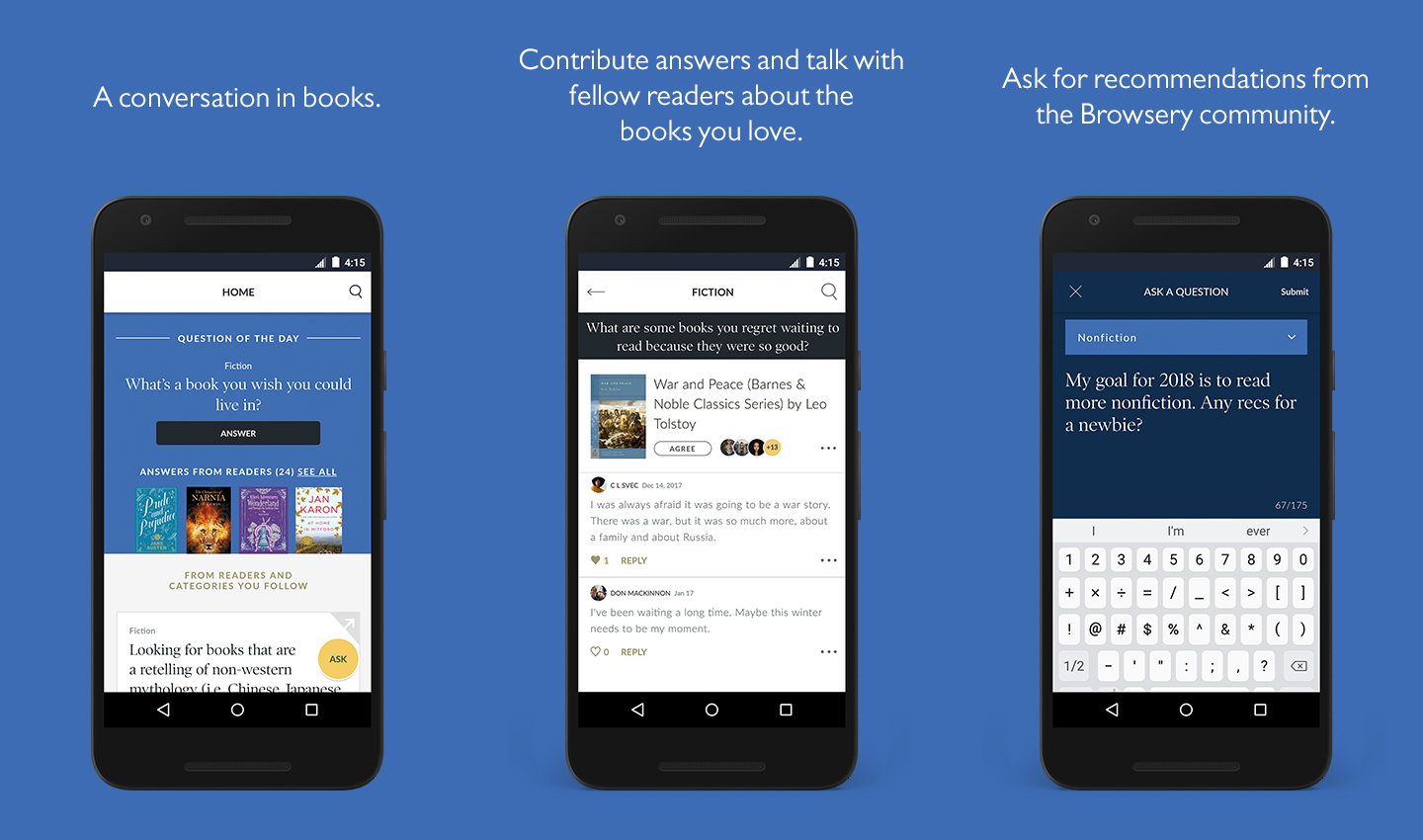 I downloaded the app this morning to give it a try. There is absolutely nothing wrong with the app. The setup is very easy for anyone to use . Everyday you are met with a “Question of the Day” which you can answer or see other readers’ answers You can also select which answer you agree with, by clicking on the book cover. The app also allows you to ask a question of you own. Most of the questions are general like, ‘What book are you currently reading?” or “What is your favorite classical book?” But then you will receive the more specific questions such as, “Have you ever bought a paperback versions of a novel that you already own in a hardcover?